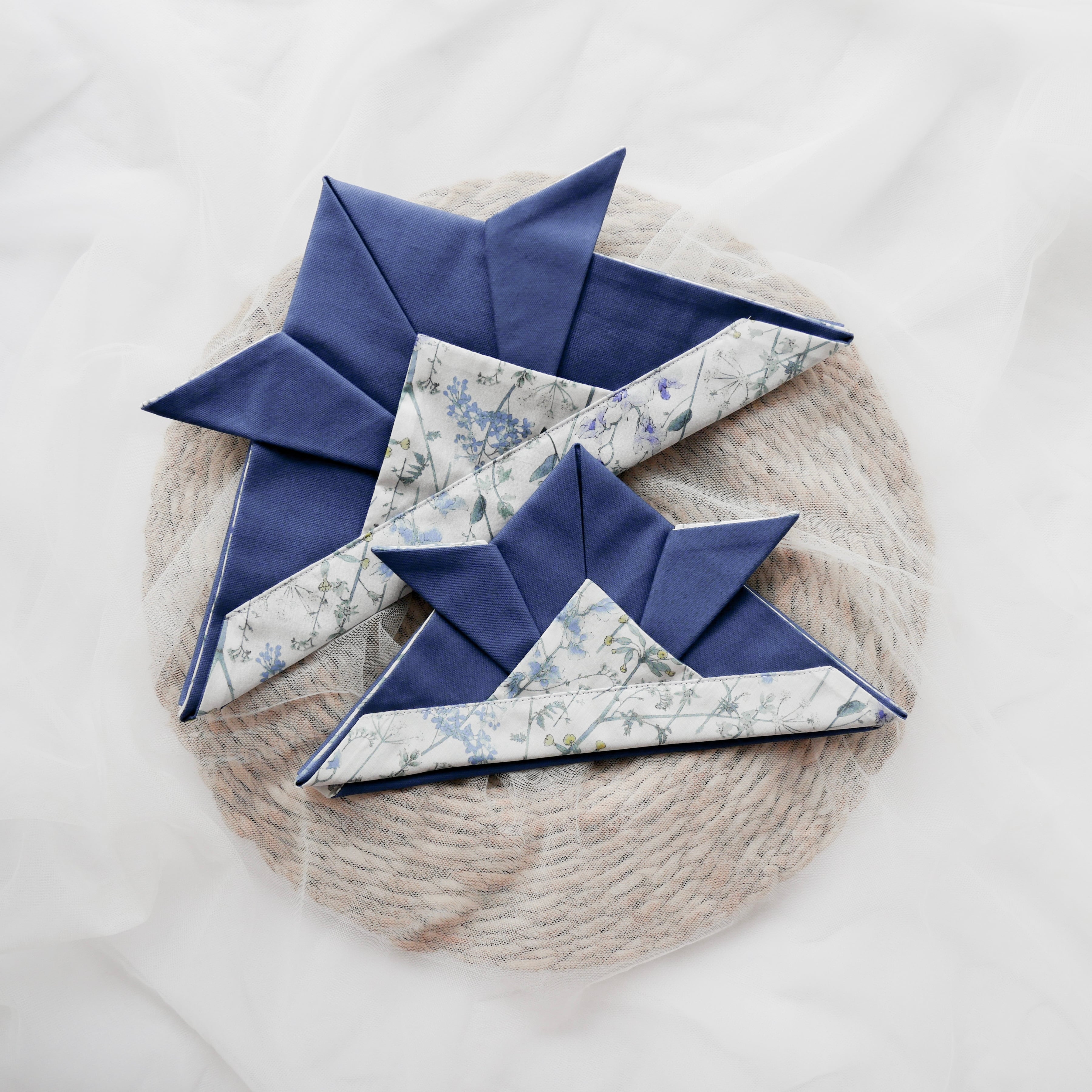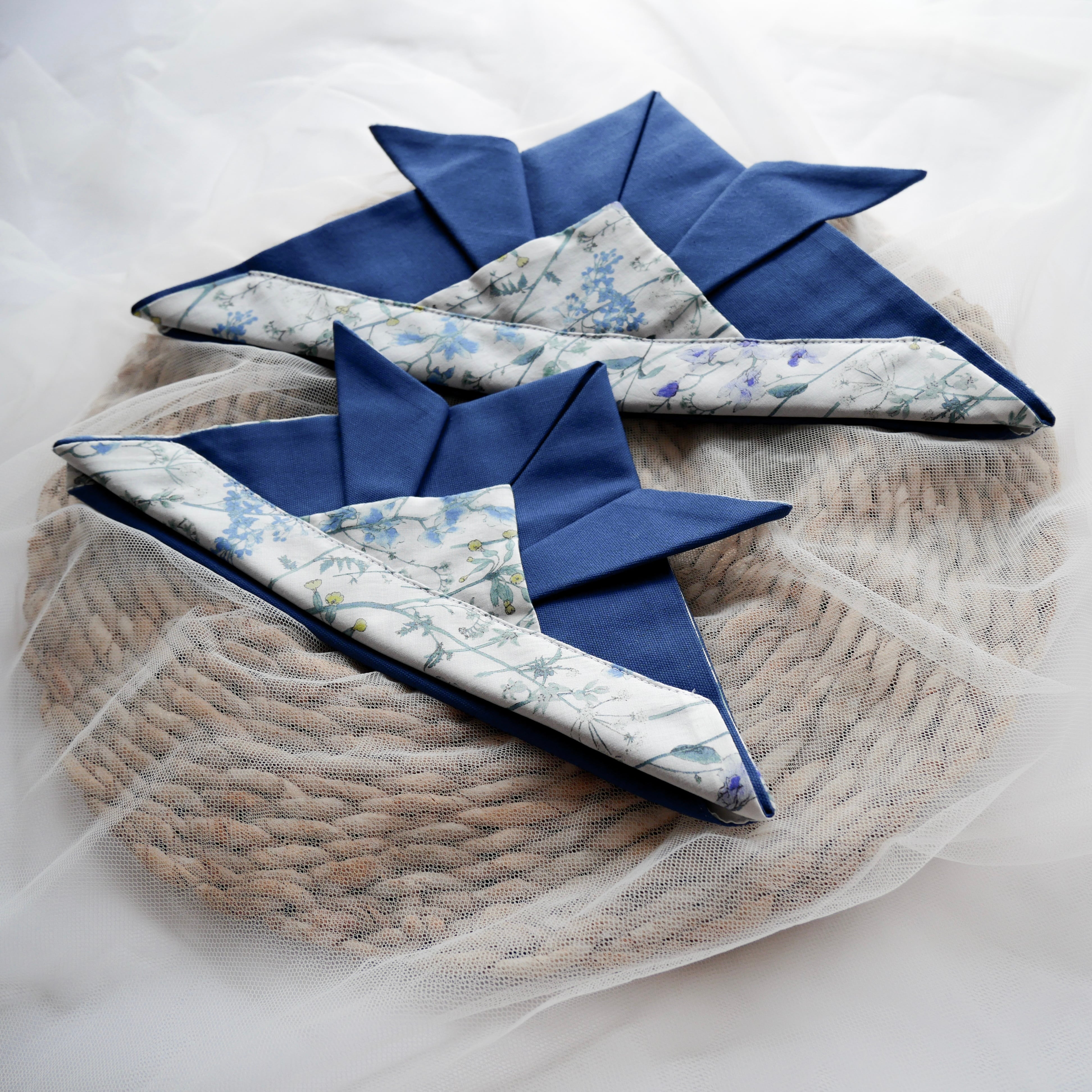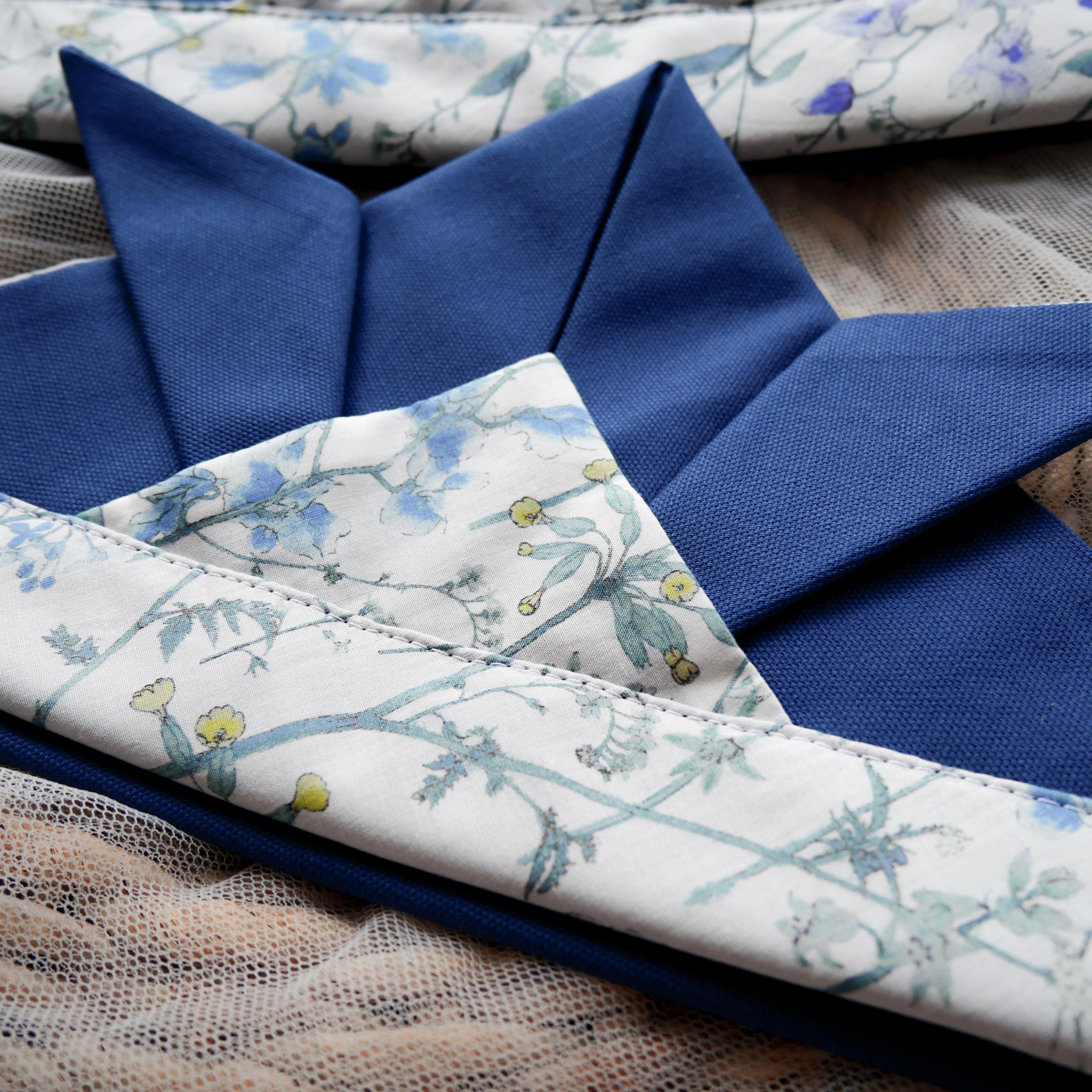 落ち着いたブルーに、可憐なリバティの小花柄を合わせた兜。