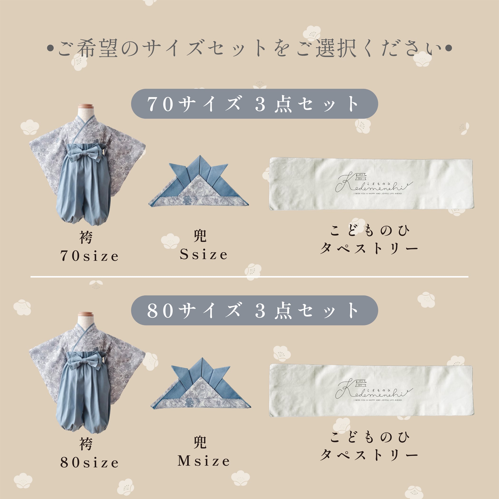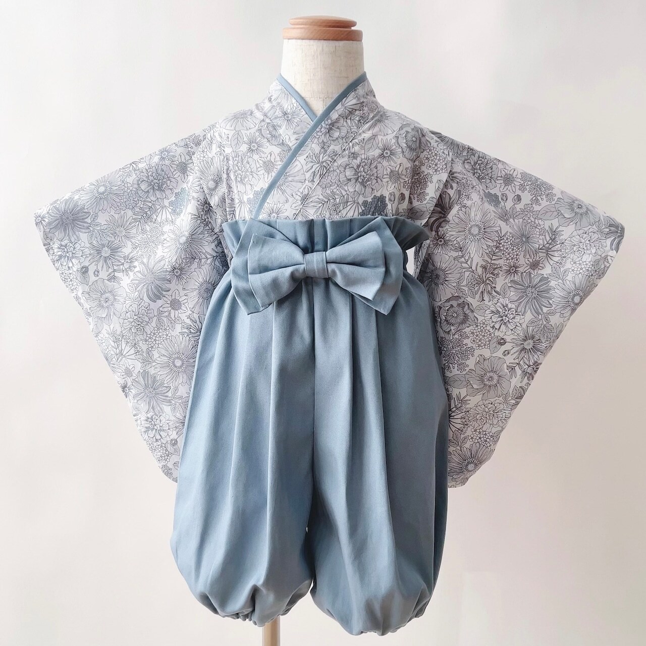 ・ベビー袴80サイズ:グレーフラワー×くすみブルー