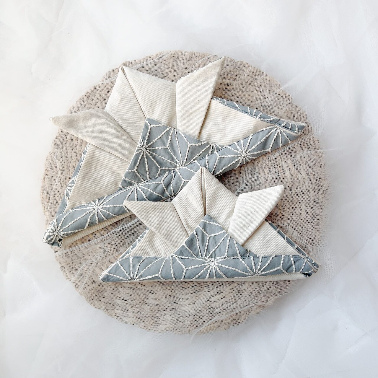 ・かぶれる兜Mサイズ:麻の葉刺繍dustyブルー×キナリ