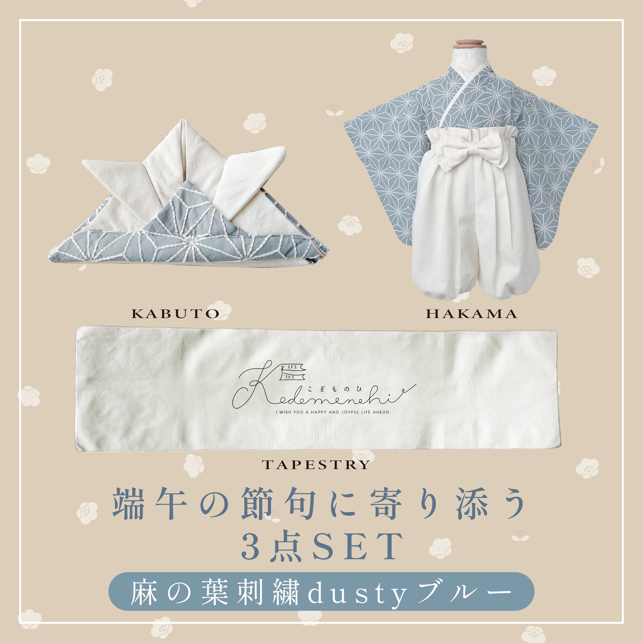【端午の節句SET】麻の葉刺繍dustyブルー×キナリ 70/80