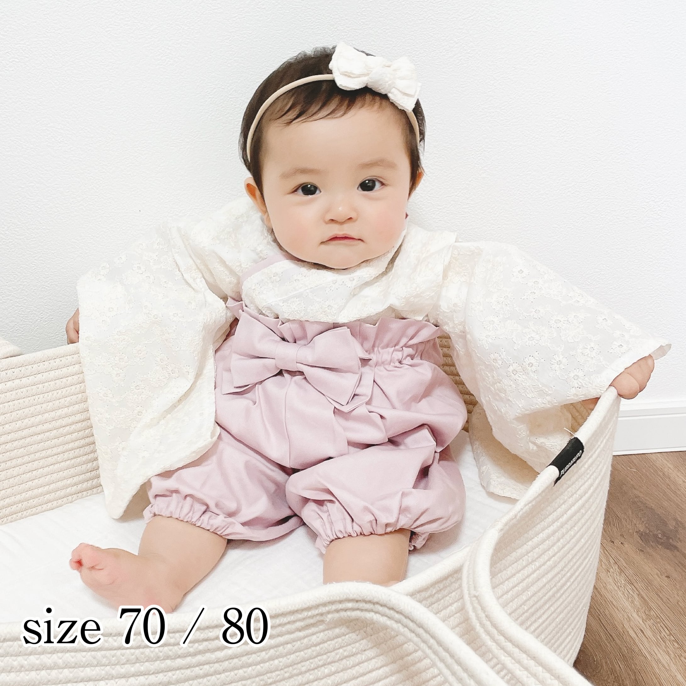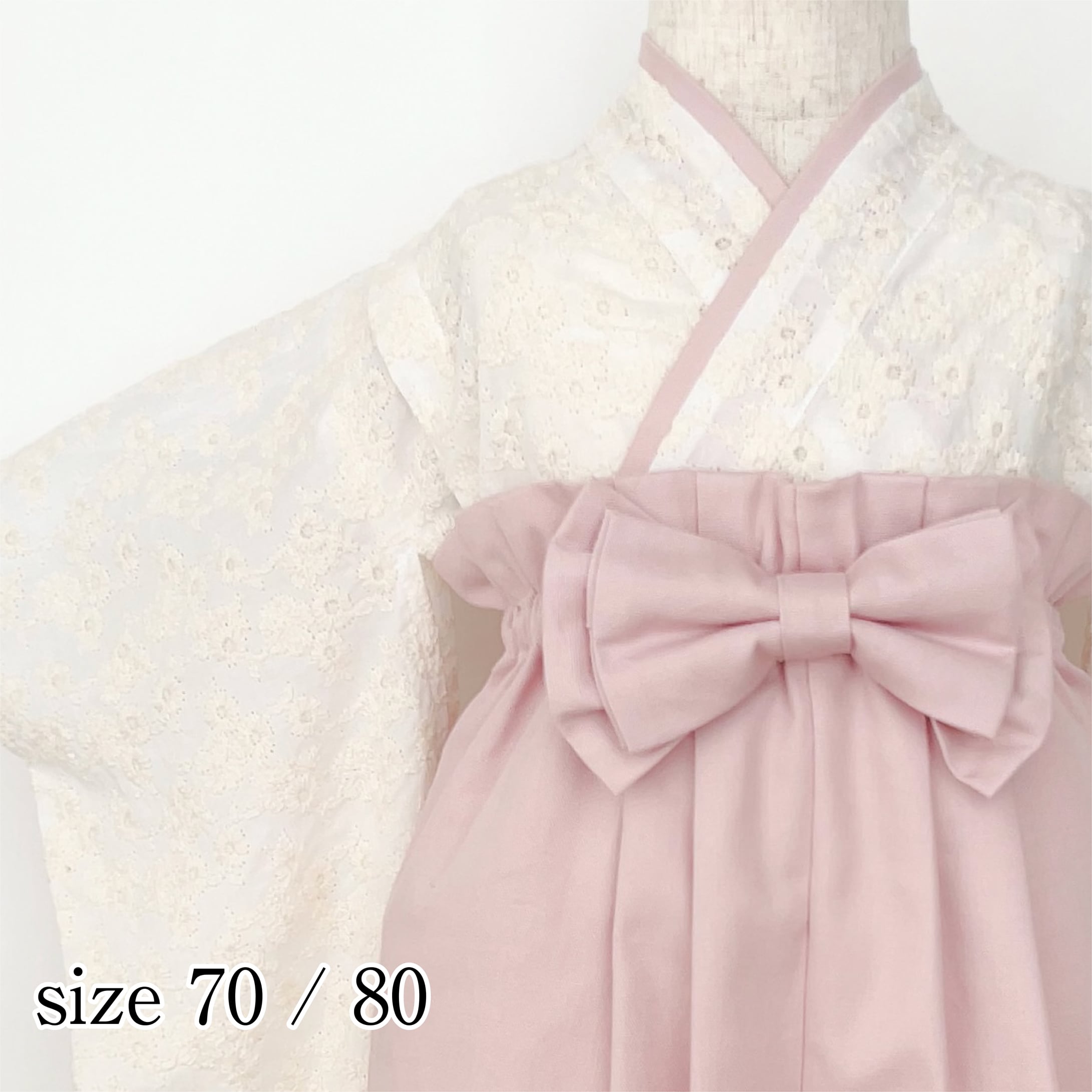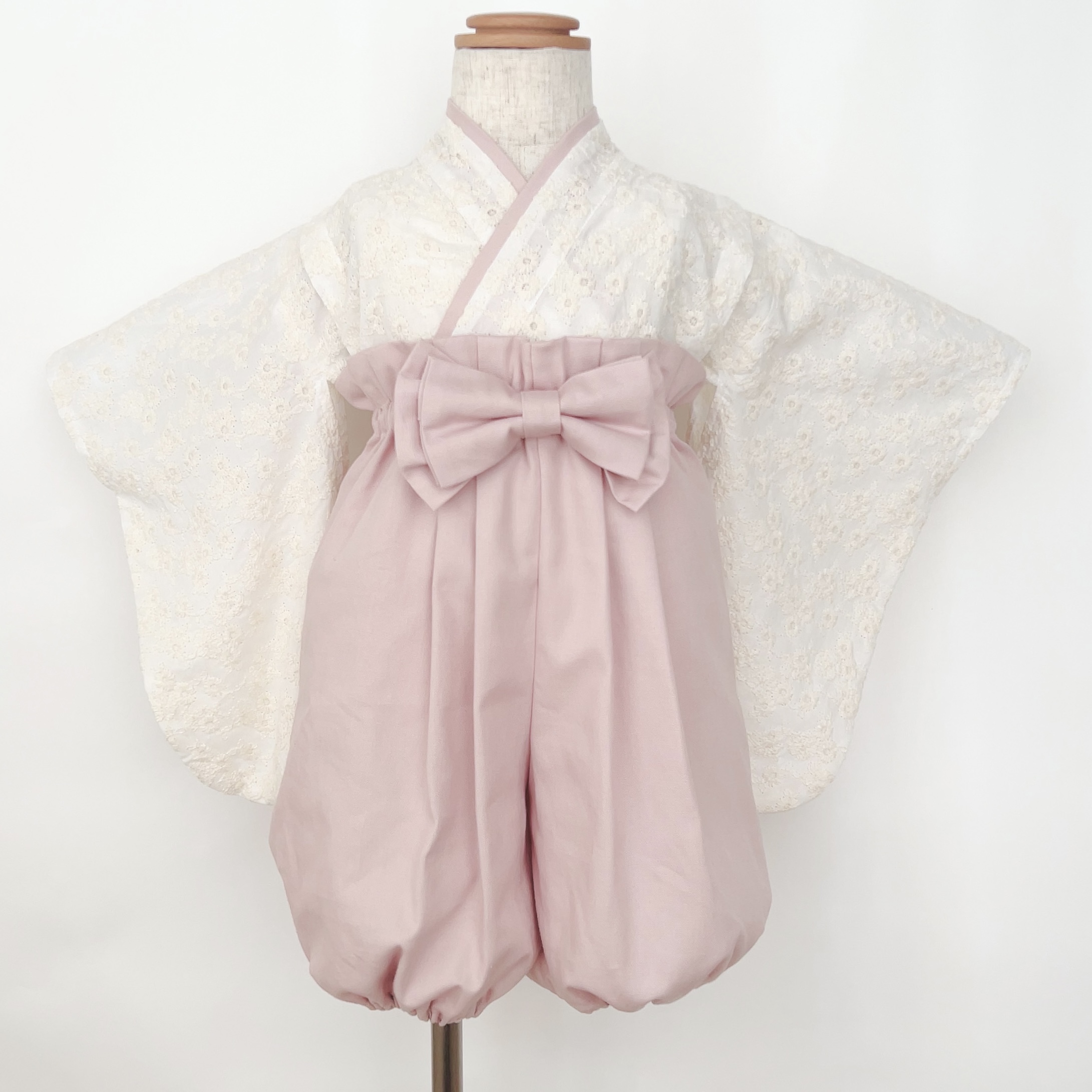 ・ベビー袴 80サイズ:小花刺繍ホワイト×くすみピンク