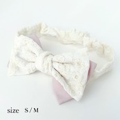 ・ダブルリボンヘアバンド Mサイズ:小花刺繍ホワイト×くすみピンク