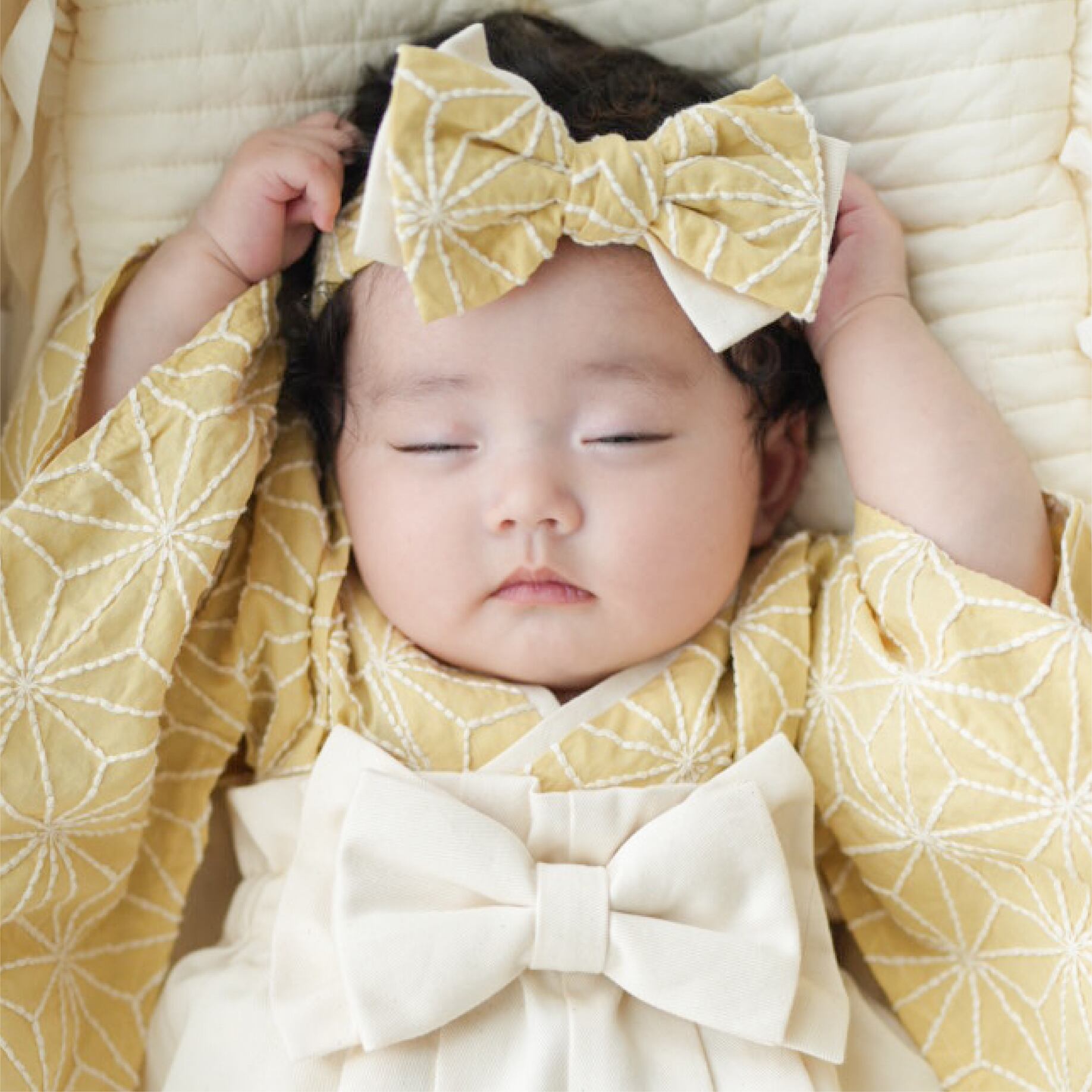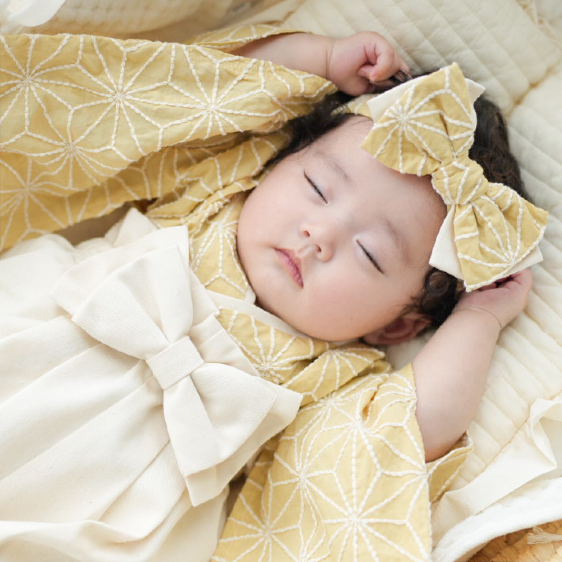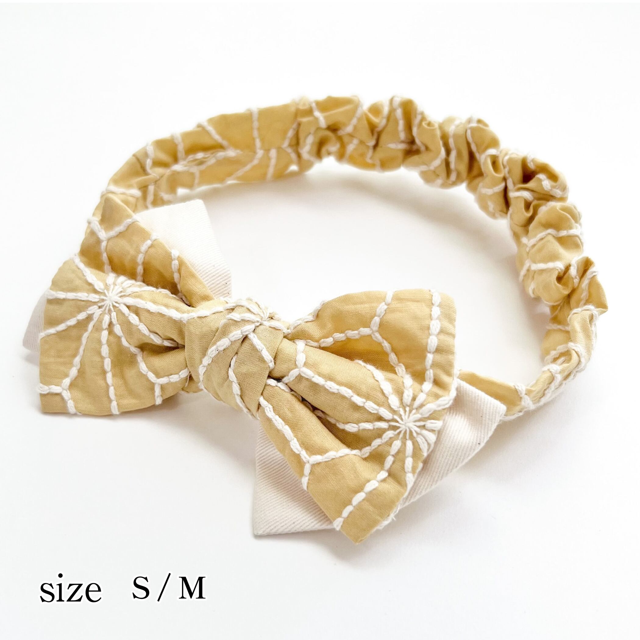 ・ダブルリボンヘアバンド Sサイズ: 麻の葉刺繍mustard×キナリ